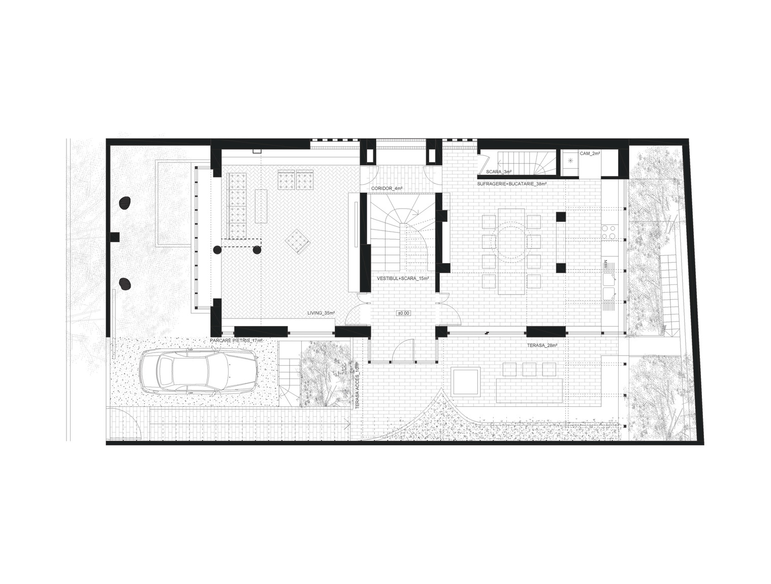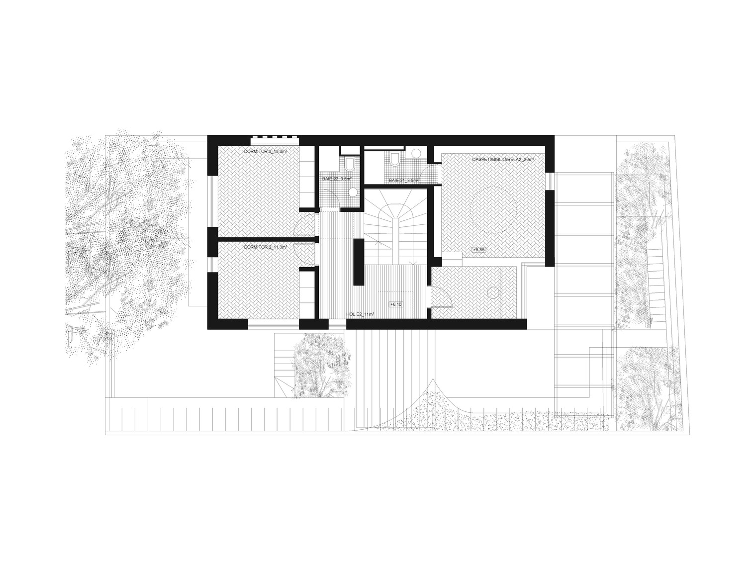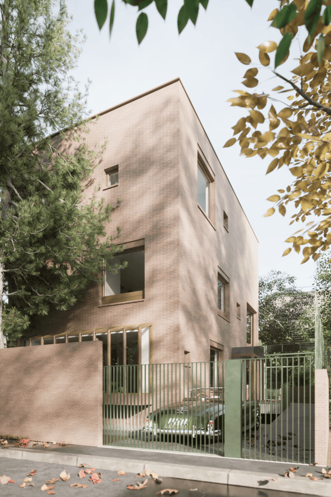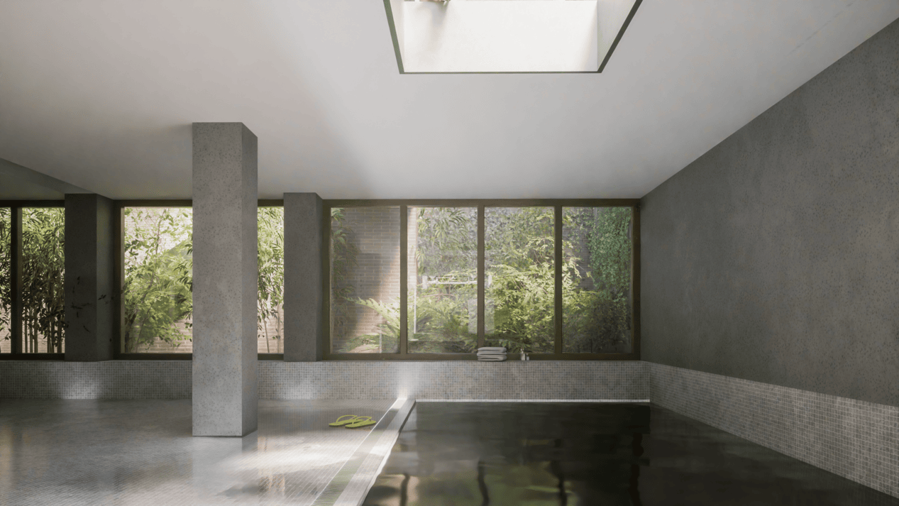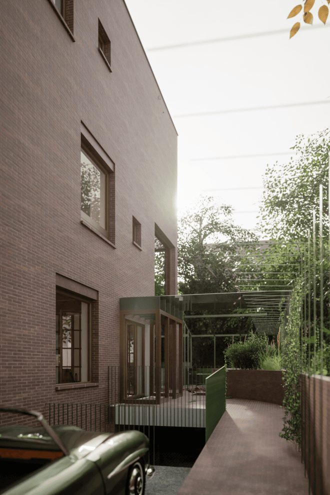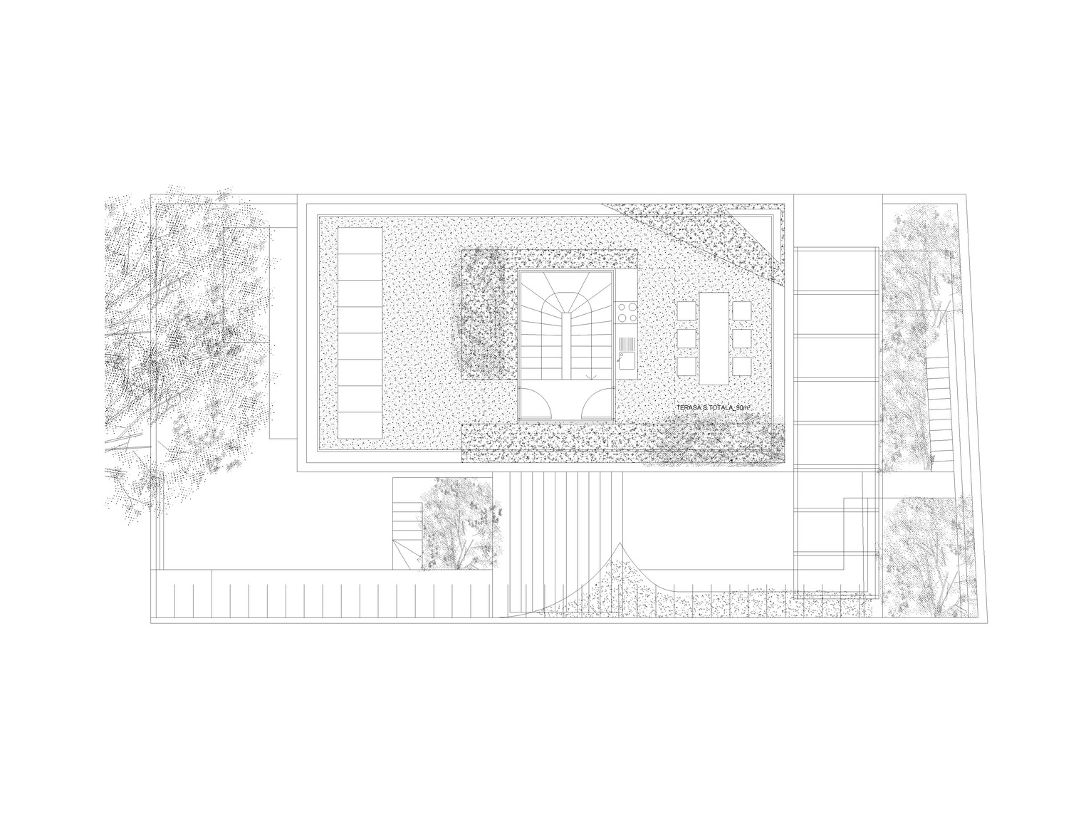 The brief involved working with an existing structure intended as a house from the 1990s—a peculiar building lacking clear architectural intentions, seemingly focused only on maximizing square footage on a narrow plot. Our project reveals its hidden spatial potential: a sunken swimming pool, a kitchen illuminated by a glass ceiling, a series of vertical, double-height spaces that connect various levels, a translucent façade, and a collection of gardens along the periphery of the plot. Together, these elements create an inhabitable, layered façade that enhances the house’s depth and character.