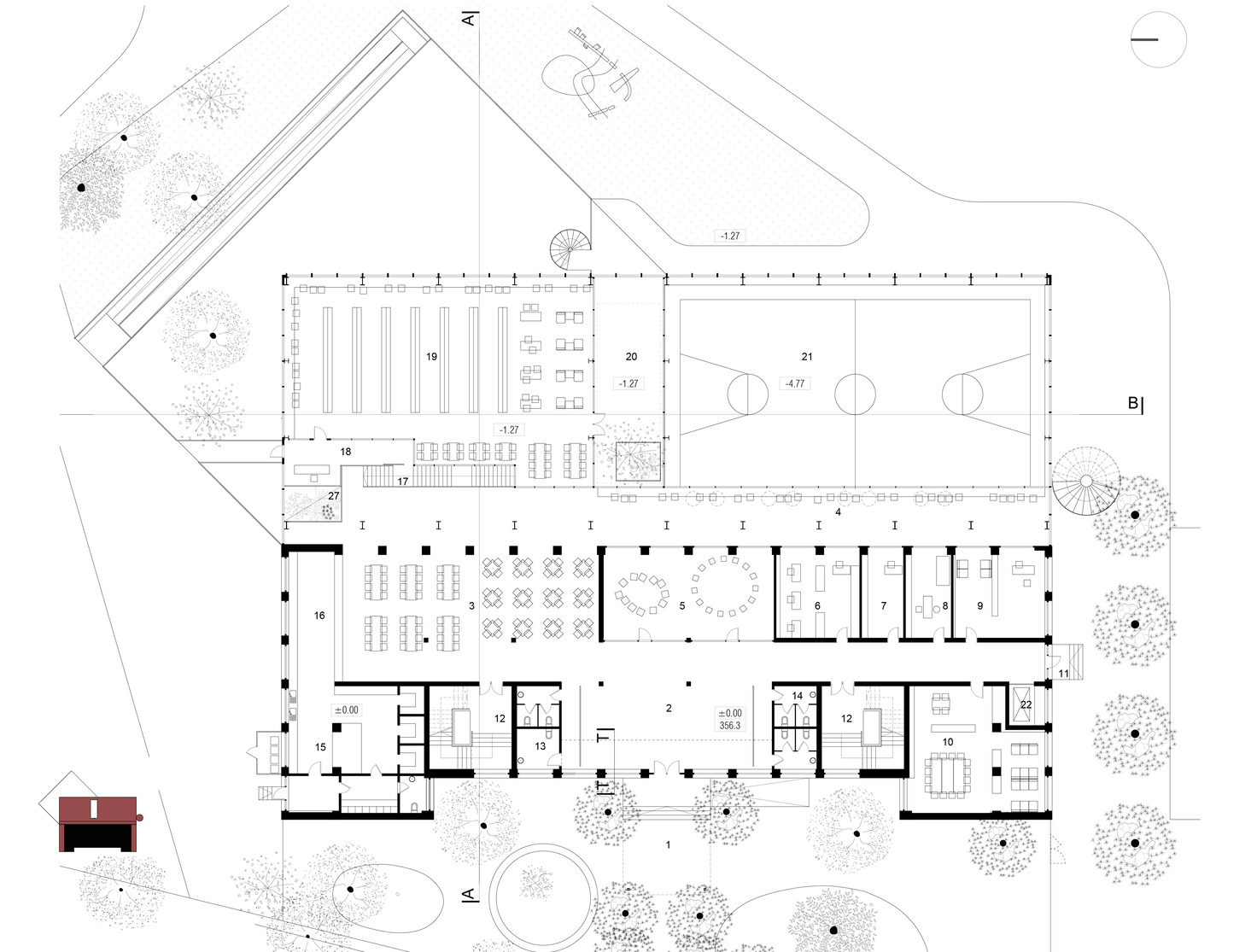 Having two distinct buildings compose the entity of one school offers the possibility to imagine a territorial architecture. Seen together, the two buildings act as an urban apparatus by offering a safe space for children, pedestrians and engendering a community sense of belonging. As such, architecture and the City are, again, one reality, one discipline. So the project understands the two buildings complementary in function (North – for preschool and elementary; South for gymnasium and high school; Library within the North, main Festivities Hall in the South) and similar in the recognizable architectural form and internal structure. They are declinations of the same beliefs in architectural principles that can open up new territories for the education of young generations.