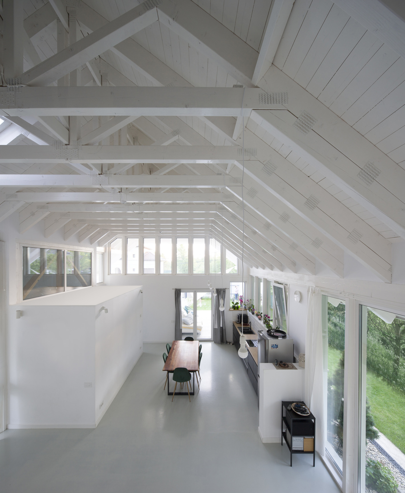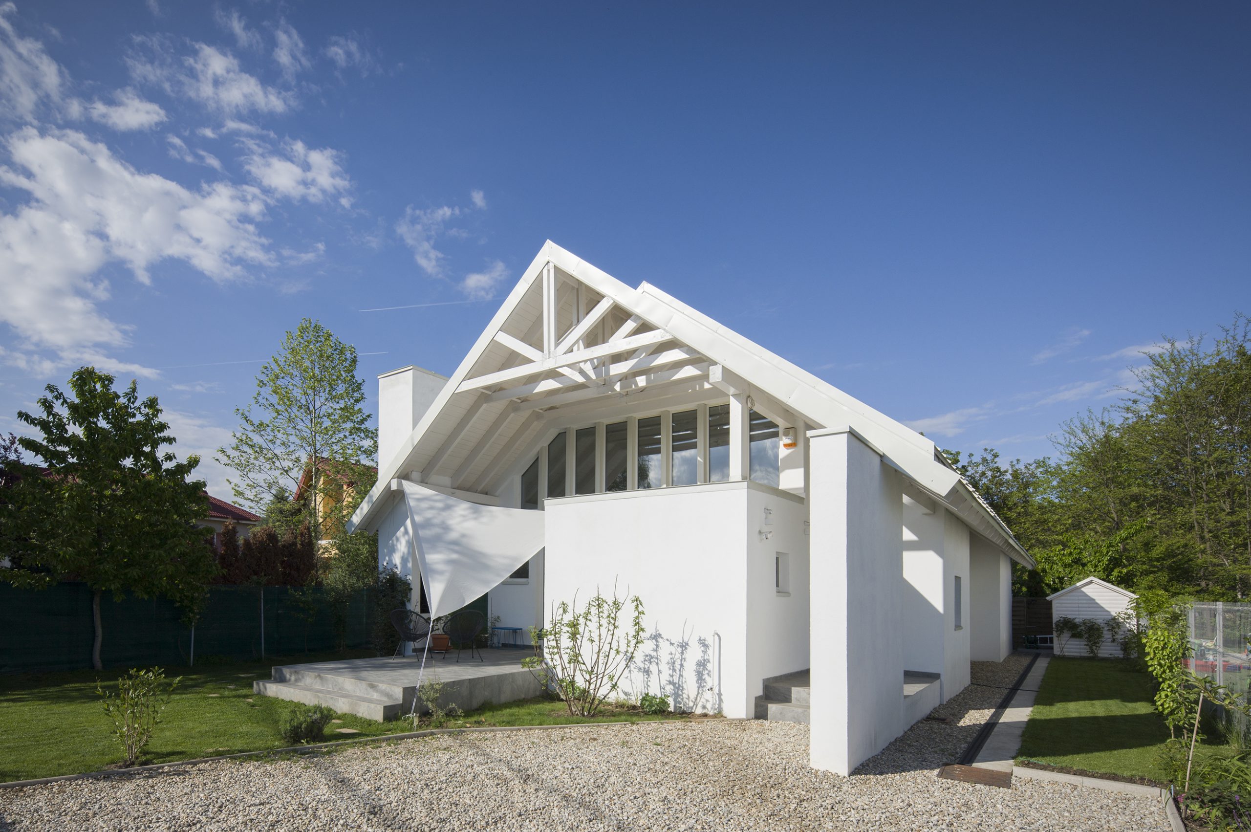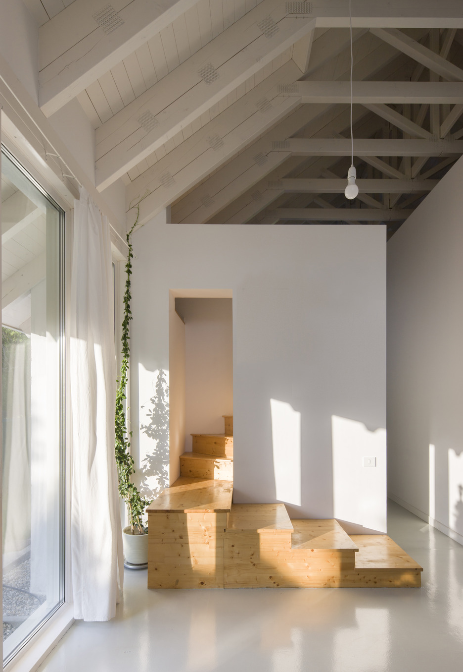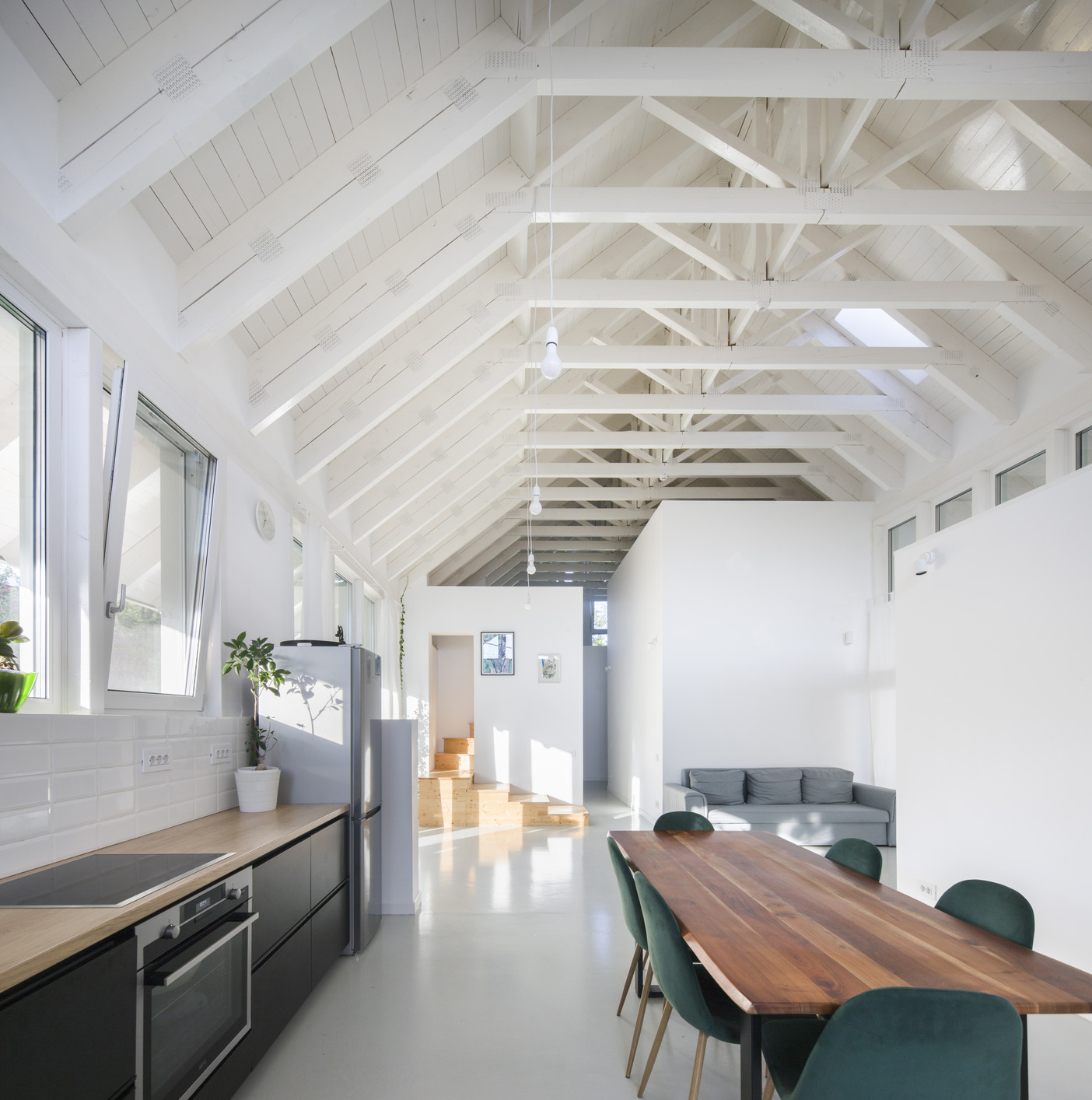 Living unfolds beneath a large, simple, two-pitched roof. Below it, a series of boxes offers the intimate, hidden spaces of the house; introverted rooms, with low height, with not-too-large windows. These boxes negatively draw the dominant, day space, in which the furniture elements that entrust domesticity find their place: the table, the sofa, the kitchen, etc. The experience of changing the architectural scale is thus strengthened by the type of ceiling (pitched/horizontal), light and chiaroscuro, glazing, etc. The height of the boxes is lower precisely to allow the roof to keep its integrity and formal simplicity; atop the boxes there is space to read and additional storage.