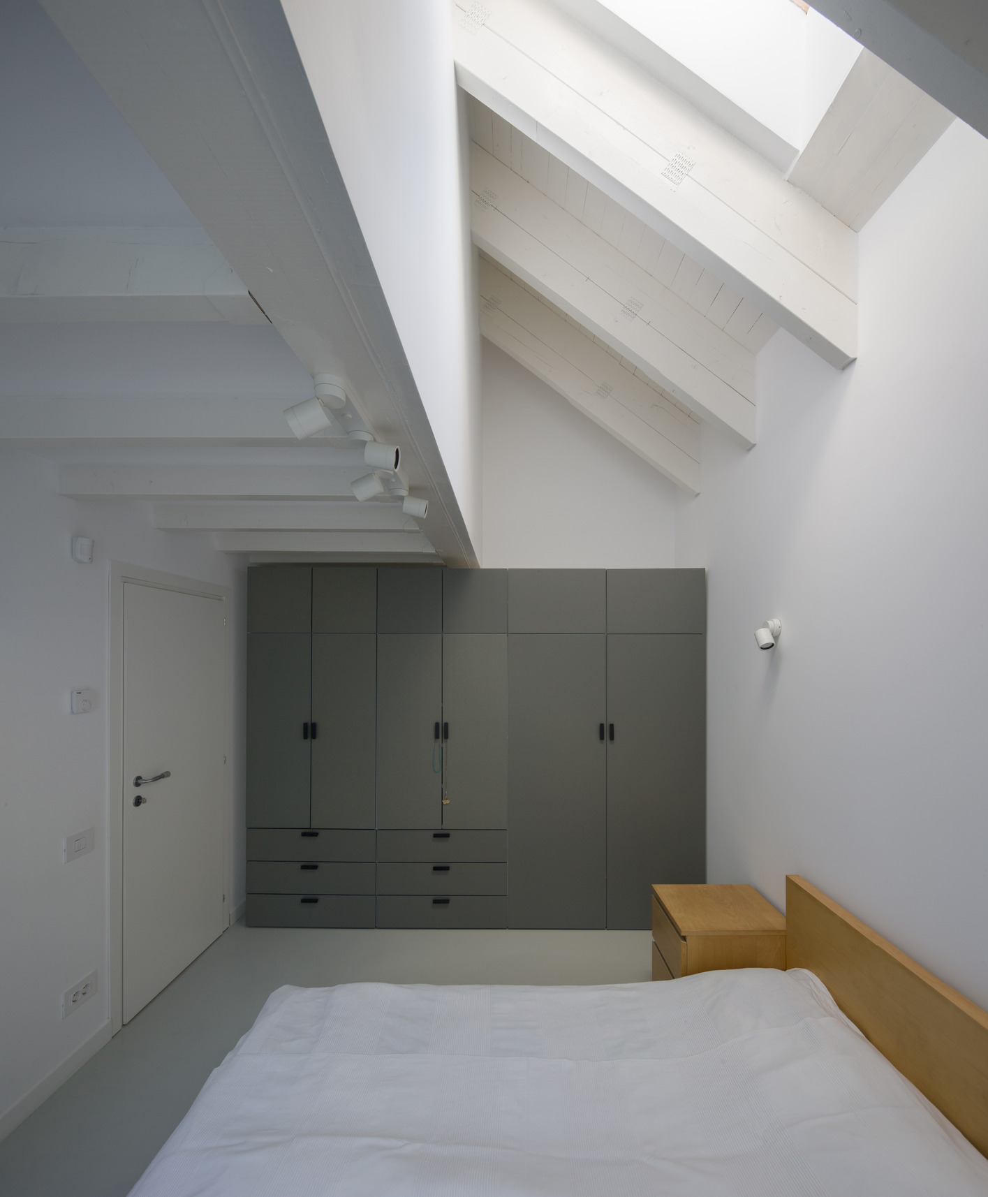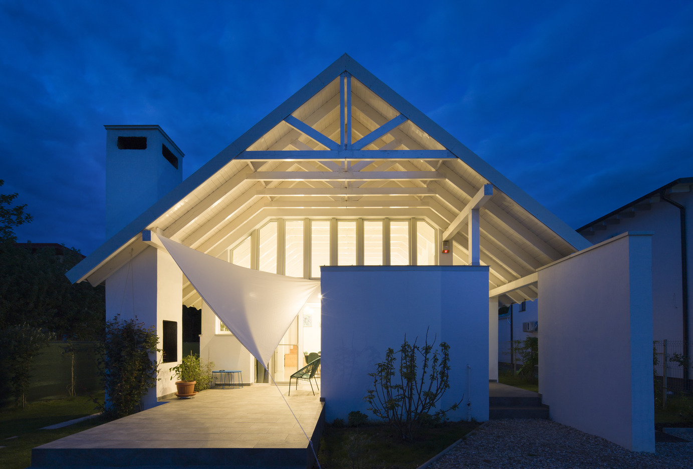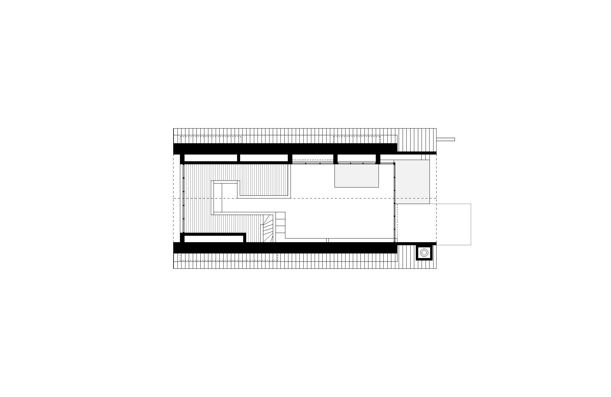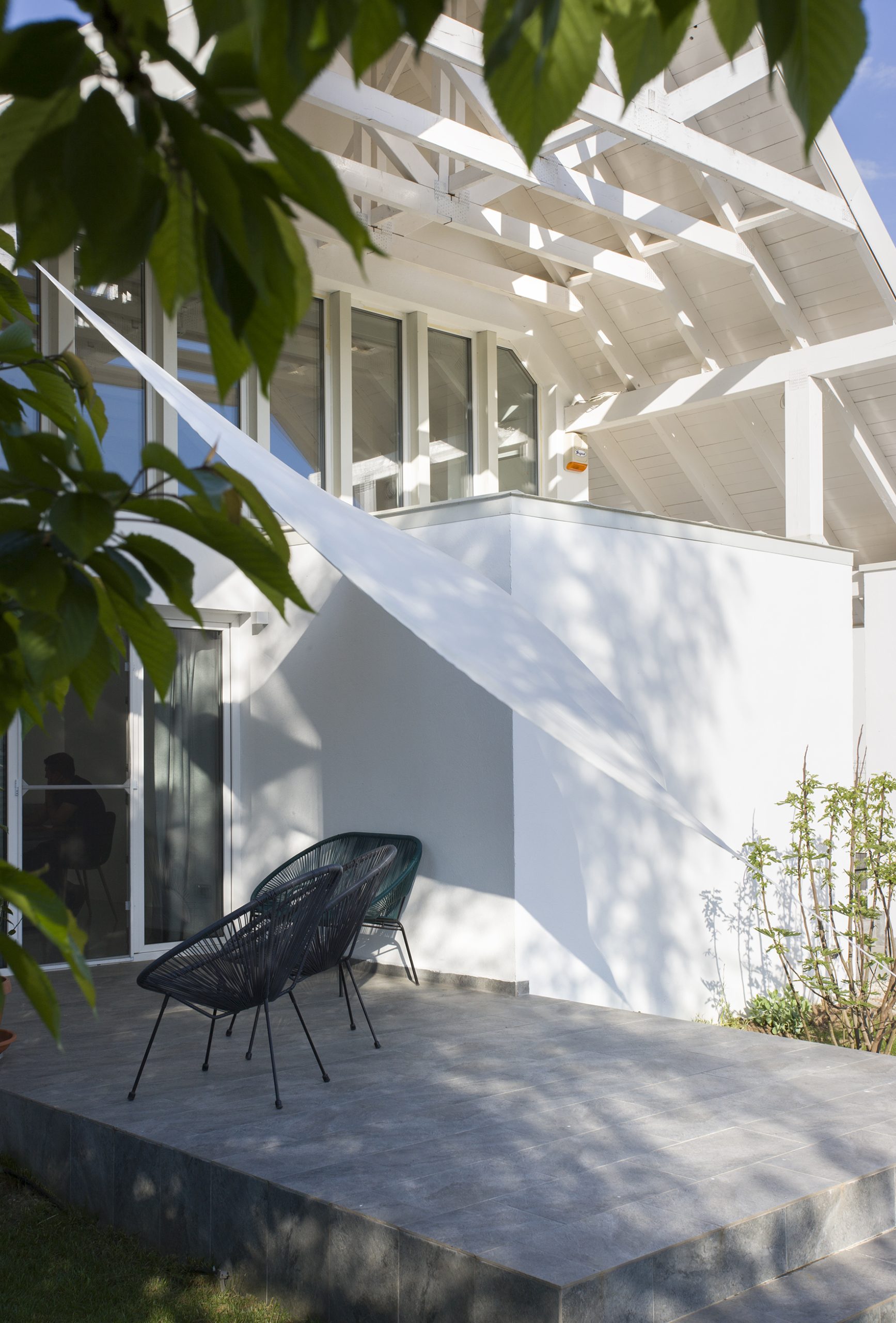 Living unfolds beneath a large, simple, two-pitched roof. Below it, a series of boxes offers the intimate, hidden spaces of the house; introverted rooms, with low height, with not-too-large windows. These boxes negatively draw the dominant, day space, in which the furniture elements that entrust domesticity find their place: the table, the sofa, the kitchen, etc. The experience of changing the architectural scale is thus strengthened by the type of ceiling (pitched/horizontal), light and chiaroscuro, glazing, etc. The height of the boxes is lower precisely to allow the roof to keep its integrity and formal simplicity; atop the boxes there is space to read and additional storage.