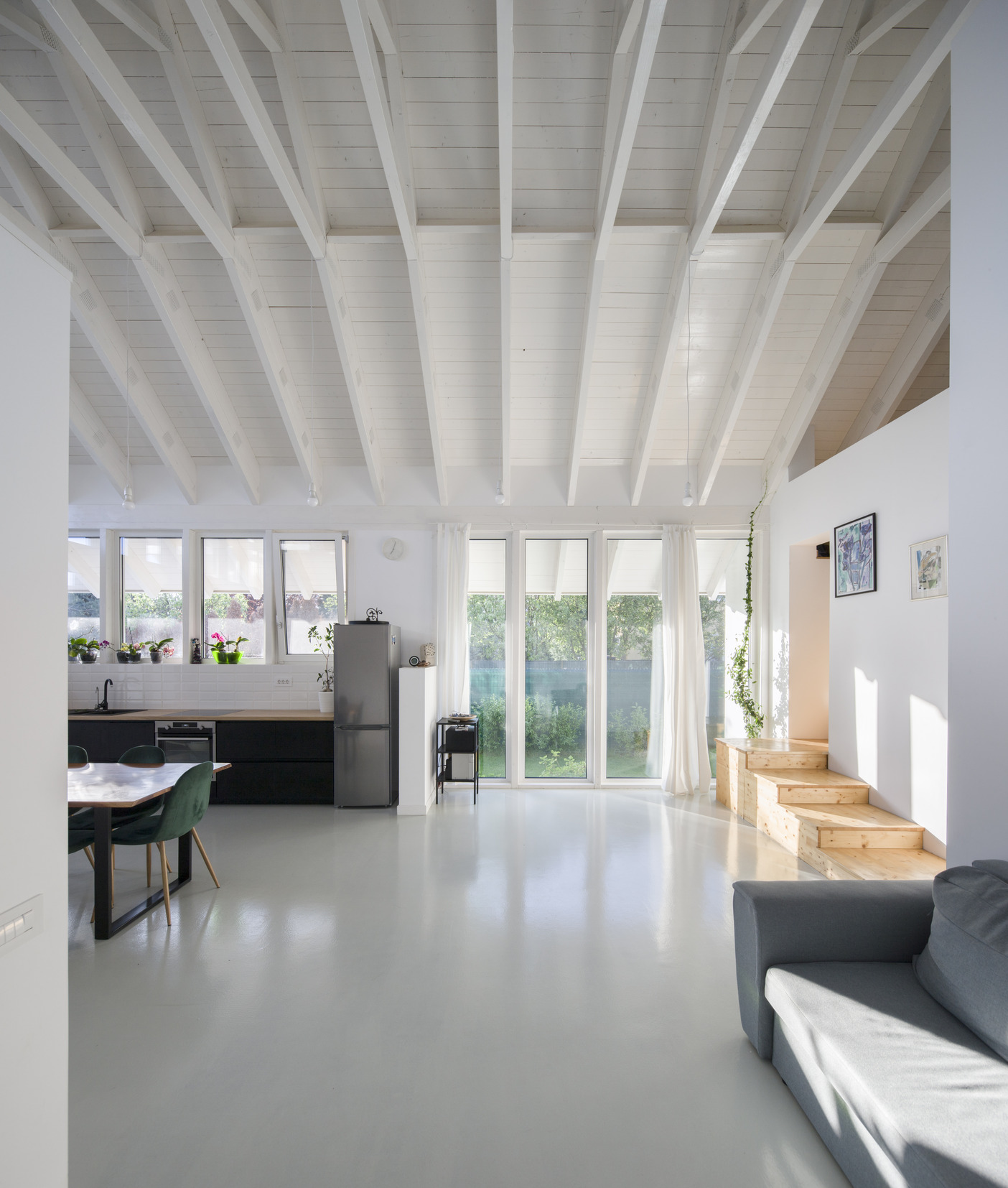 The house is constructed with a wooden structure, completed over a nine-month process. Since the roof unifies and shapes the spatial experience of the home, we aimed to make its structural expression visible in the interior design, with thermal insulation placed above the roofline to maintain its clean interior profile.