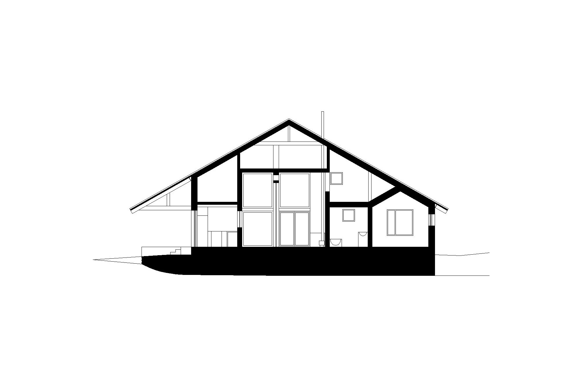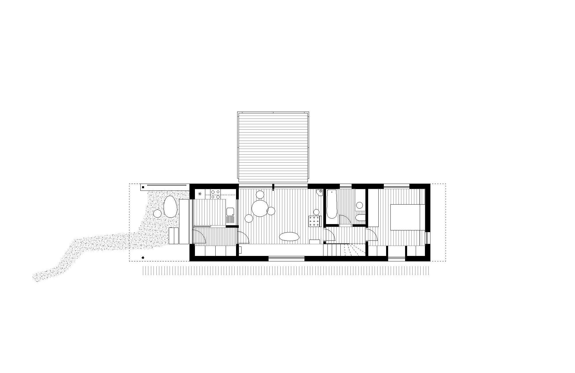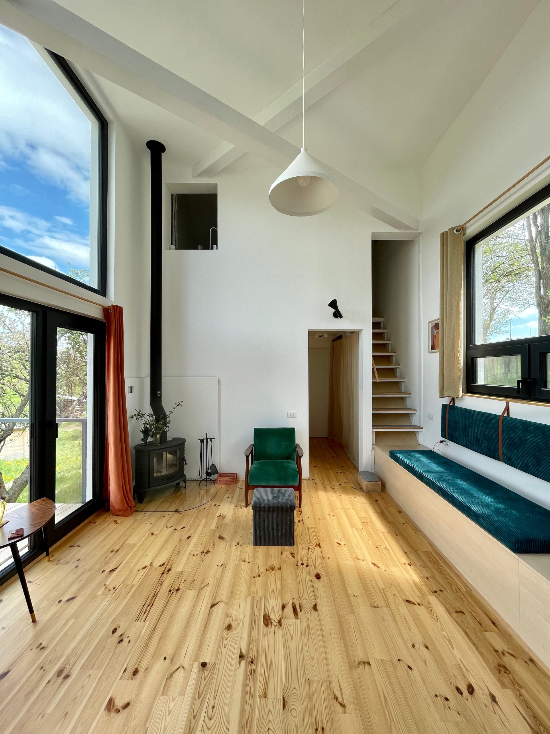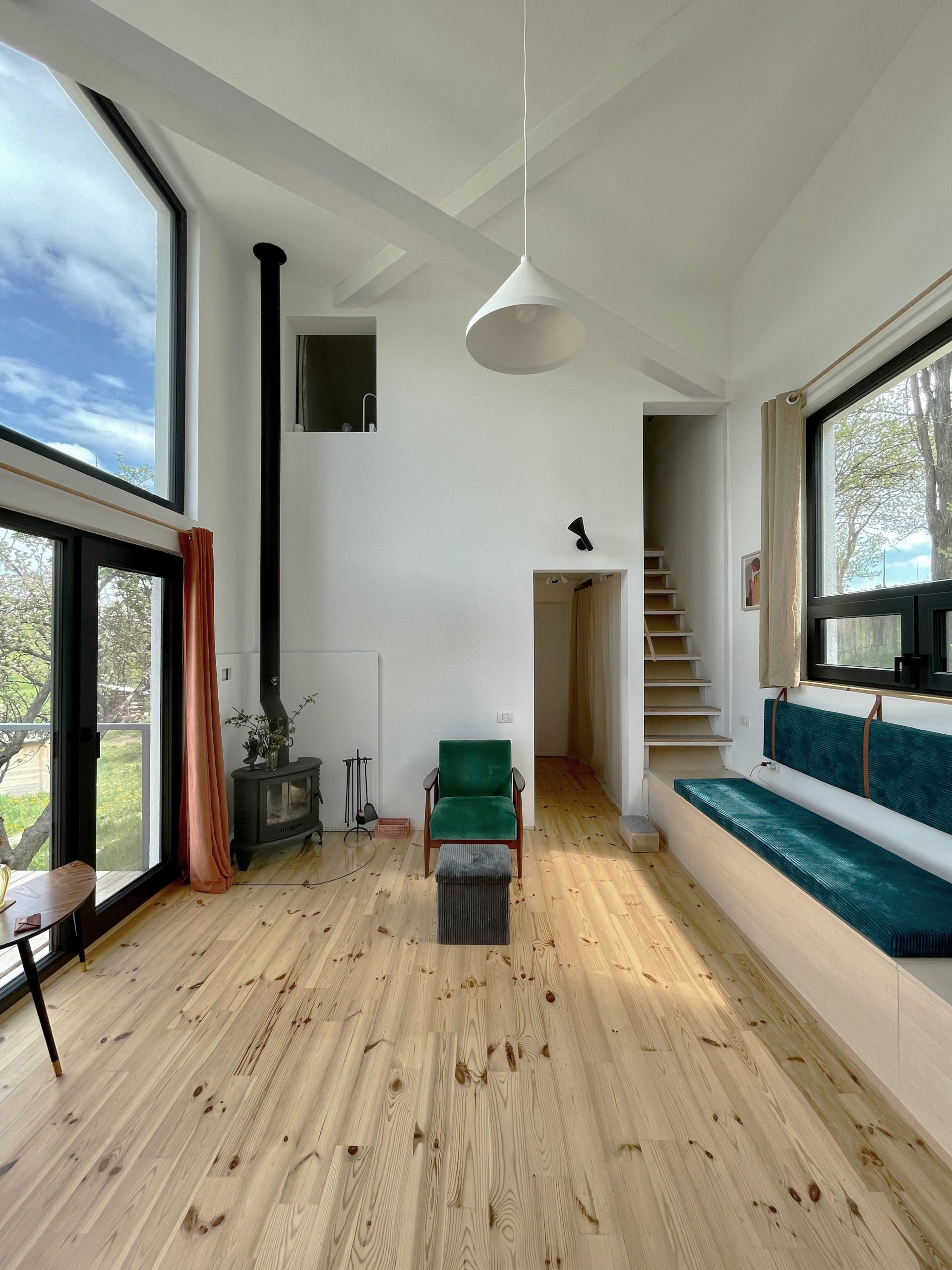 The cabin is a compact mountain retreat, designed with a dynamic, playful approach to scale. Discreet, enclosed spaces gather around a central, double-height chamber that opens broadly to capture sweeping scenic views. The essence of the project is captured in the longitudinal section. Two distinct outdoor areas enhance the experience: a sheltered ground-level space adjoining the kitchen, and a cantilevered terrace accessible from the living room, offering panoramic views of Paltinu Lake, located 5 km away. All rooms, except for the master bedroom and bathroom, are aligned in a sequence and interconnected through windows and openings that maintain a visual flow, creating a sense of interior facades throughout.