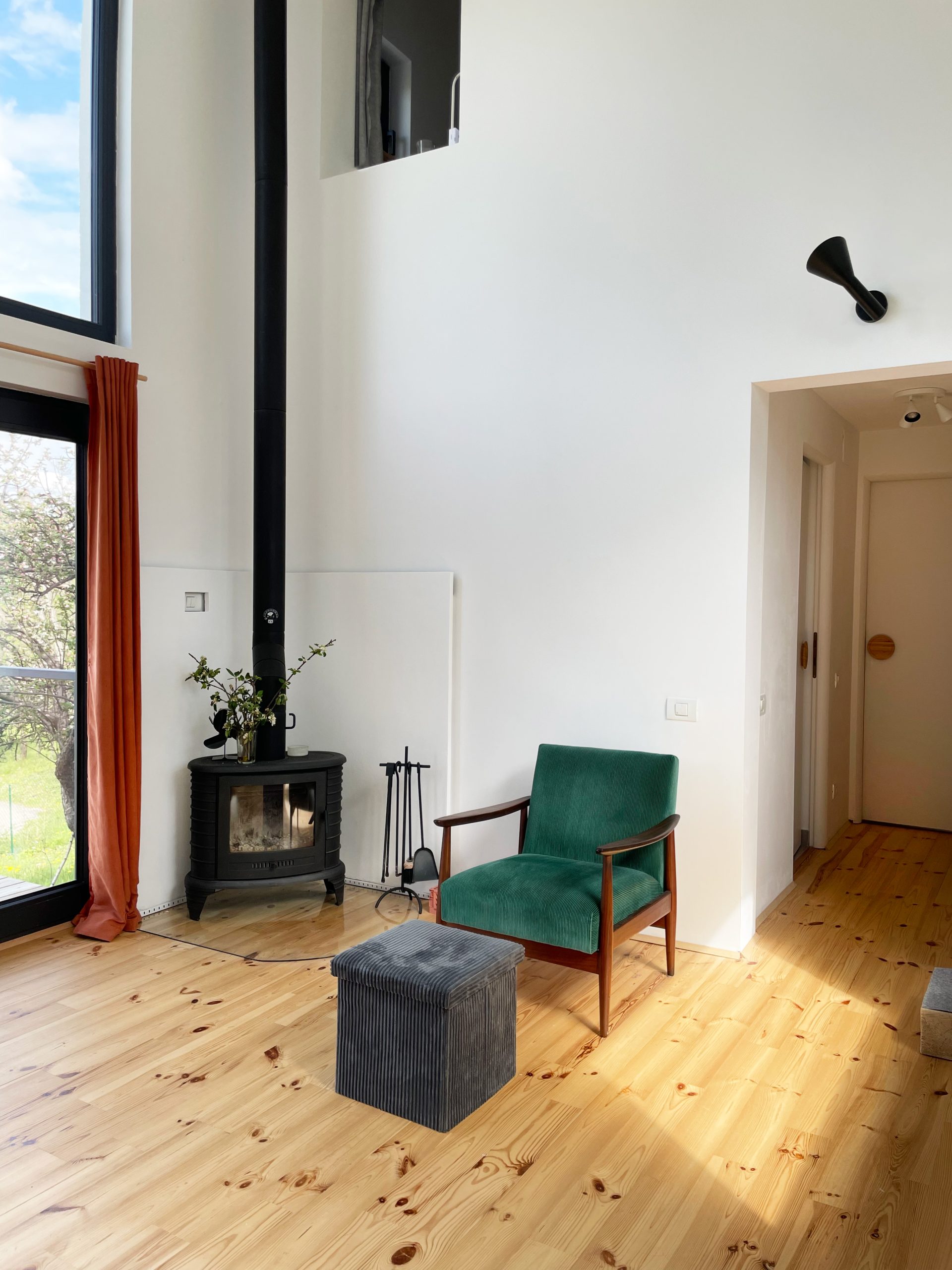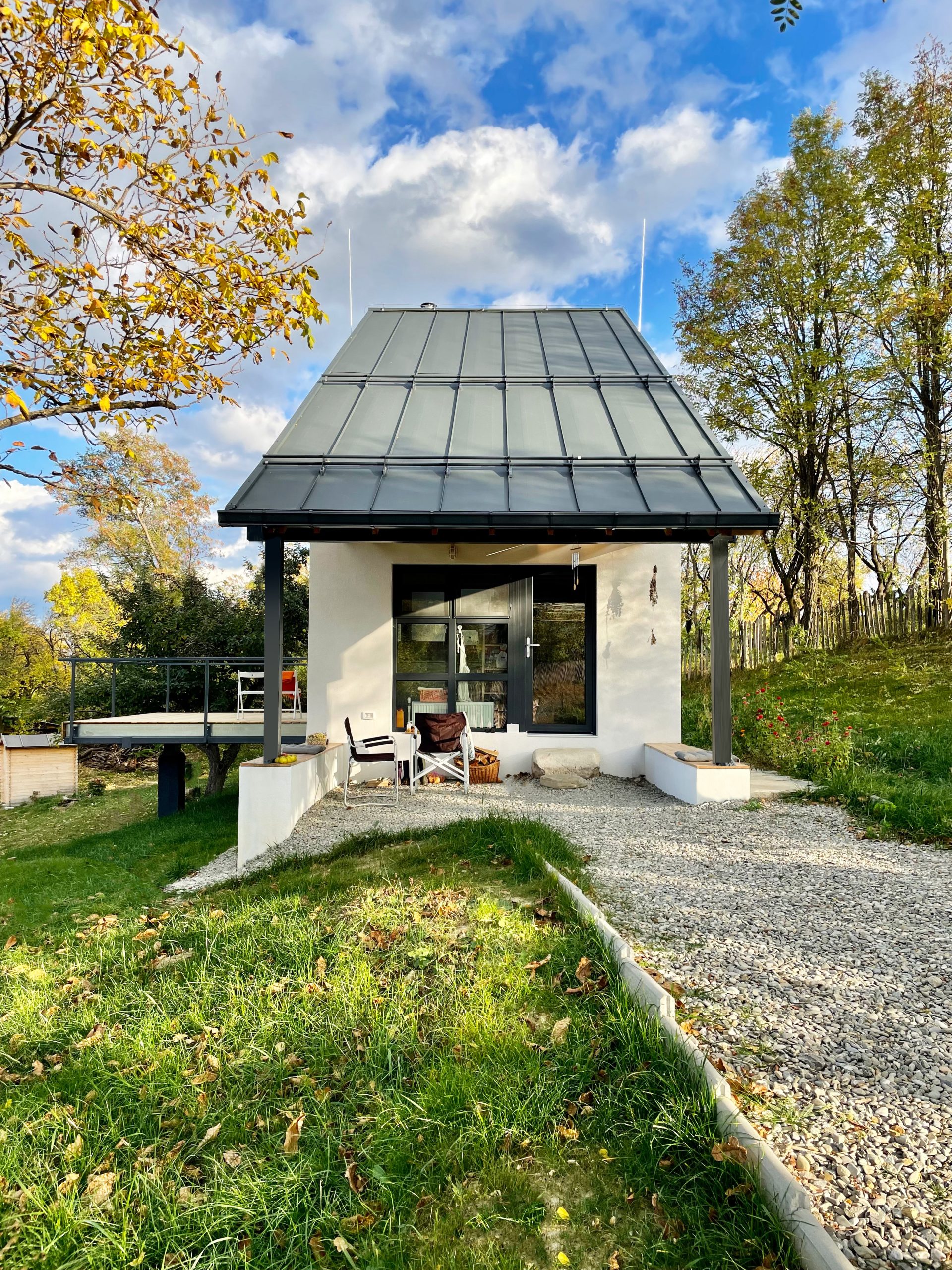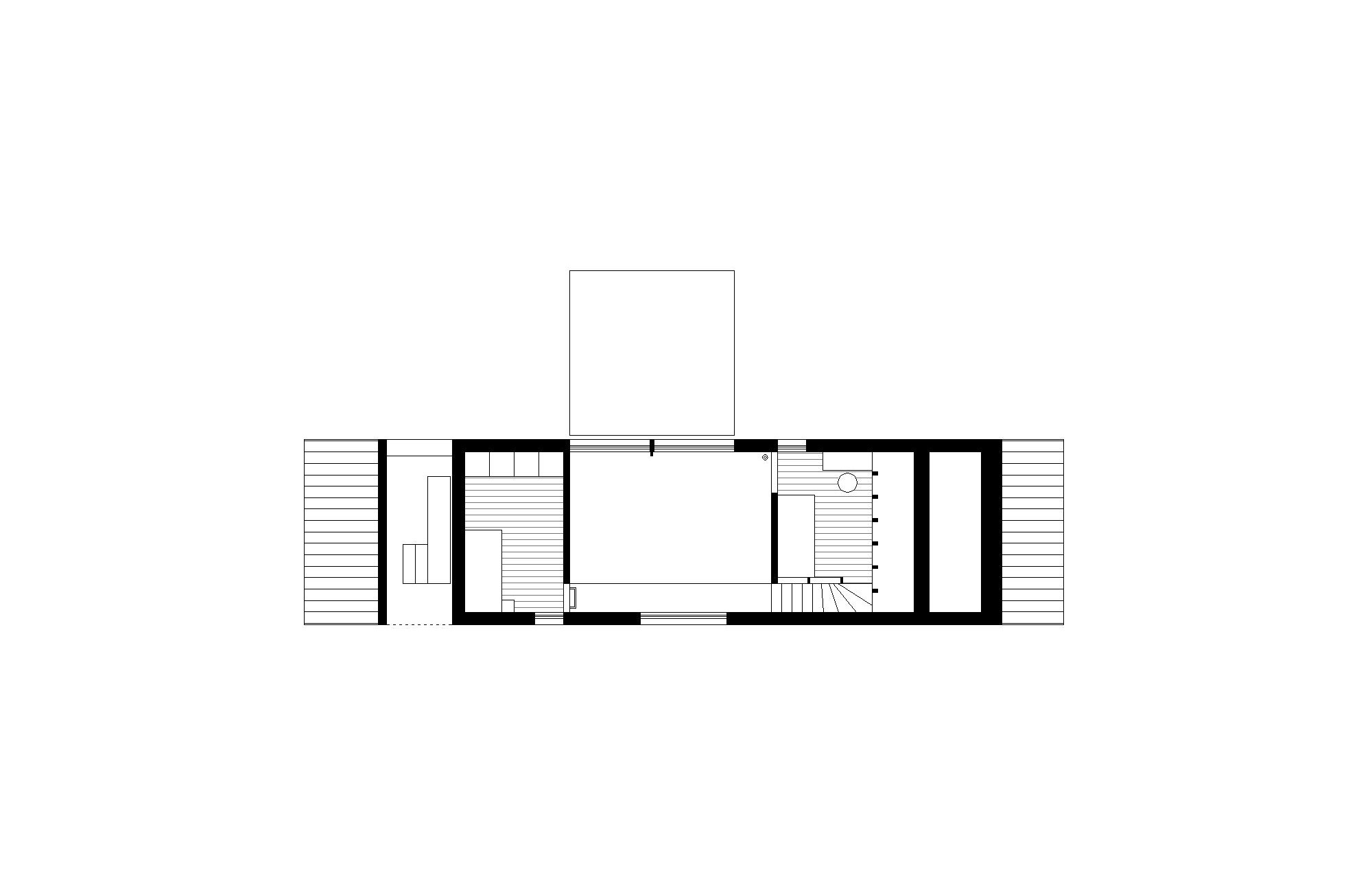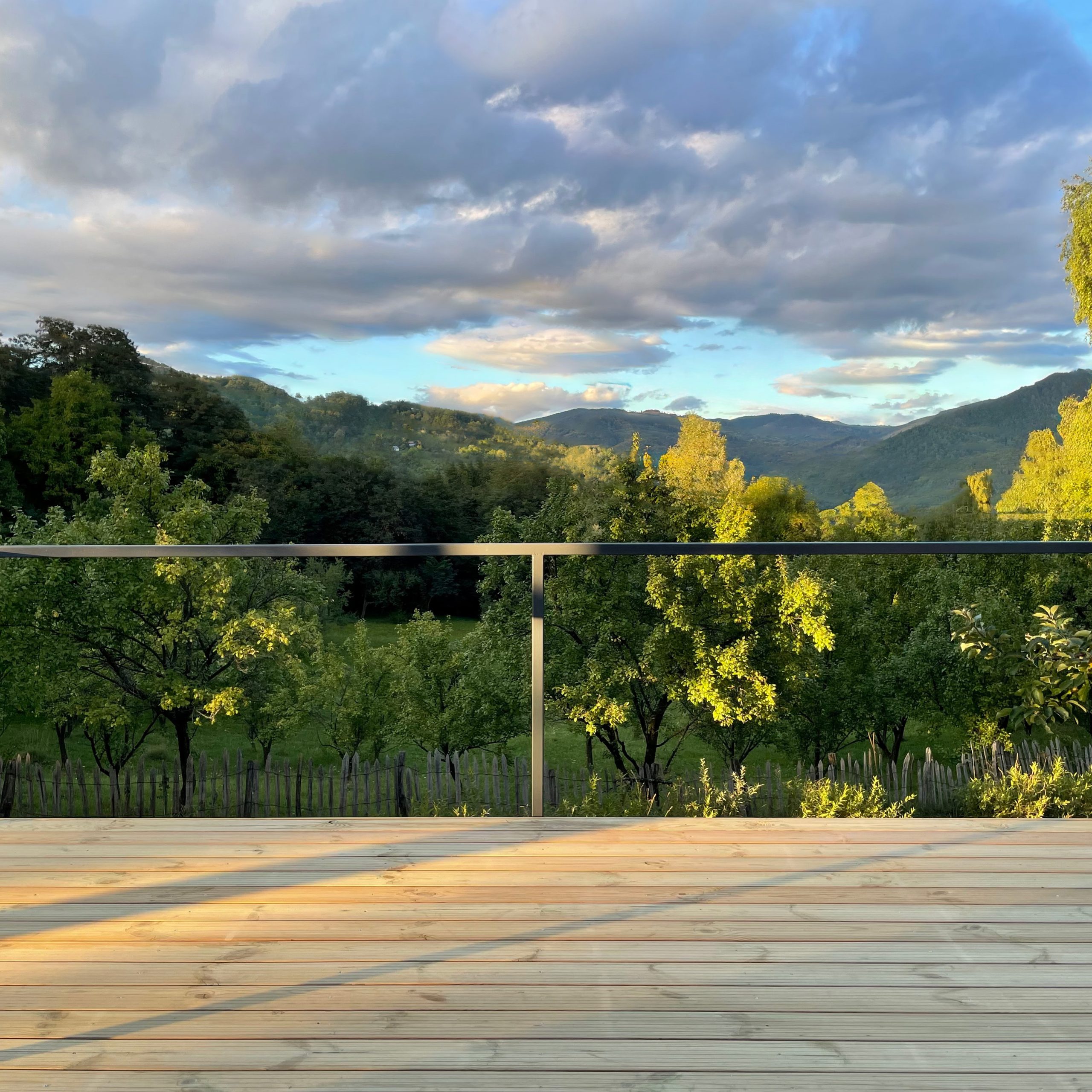 The cabin is a compact mountain retreat, designed with a dynamic, playful approach to scale. Discreet, enclosed spaces gather around a central, double-height chamber that opens broadly to capture sweeping scenic views. The essence of the project is captured in the longitudinal section. Two distinct outdoor areas enhance the experience: a sheltered ground-level space adjoining the kitchen, and a cantilevered terrace accessible from the living room, offering panoramic views of Paltinu Lake, located 5 km away. All rooms, except for the master bedroom and bathroom, are aligned in a sequence and interconnected through windows and openings that maintain a visual flow, creating a sense of interior facades throughout.