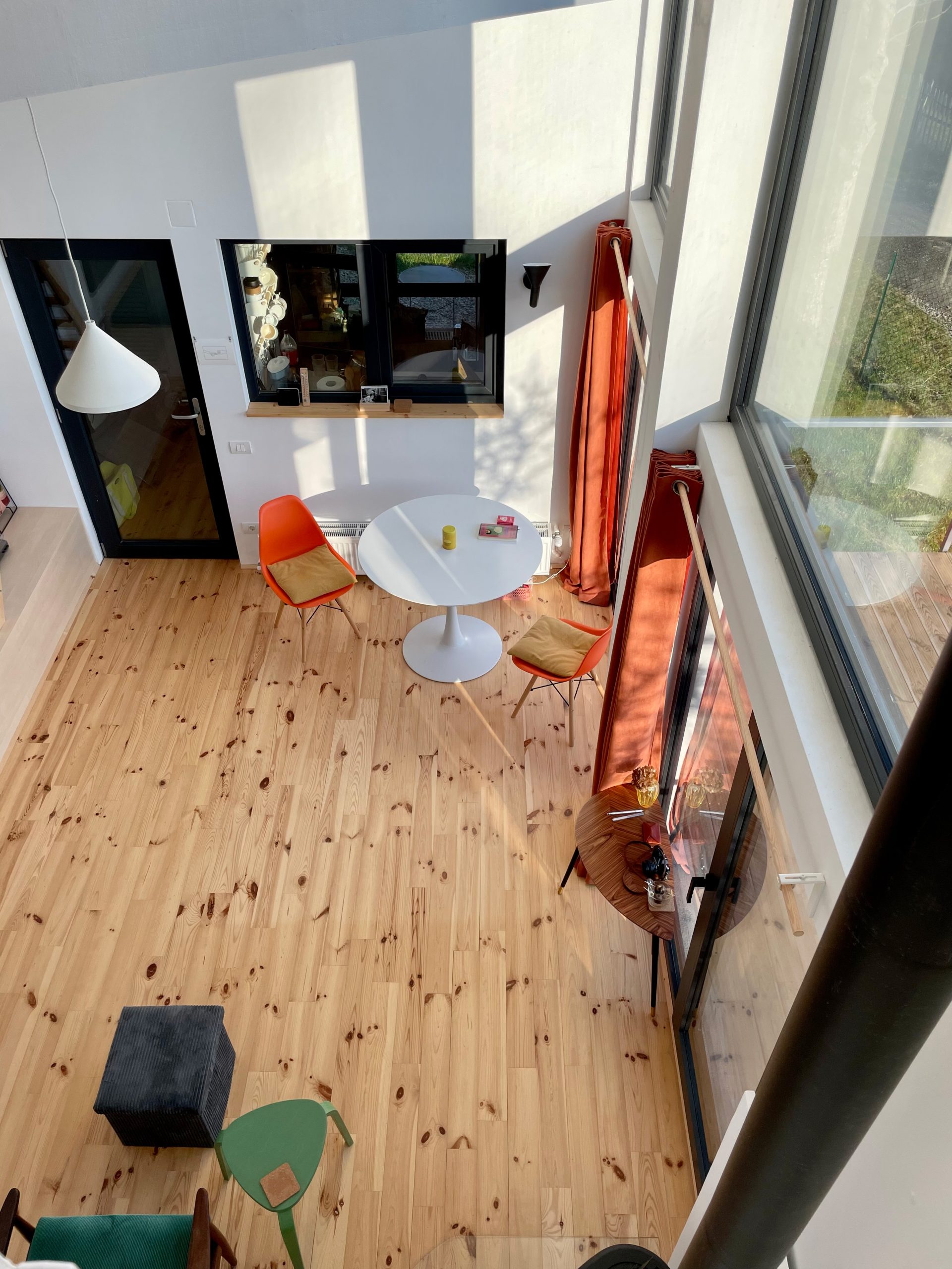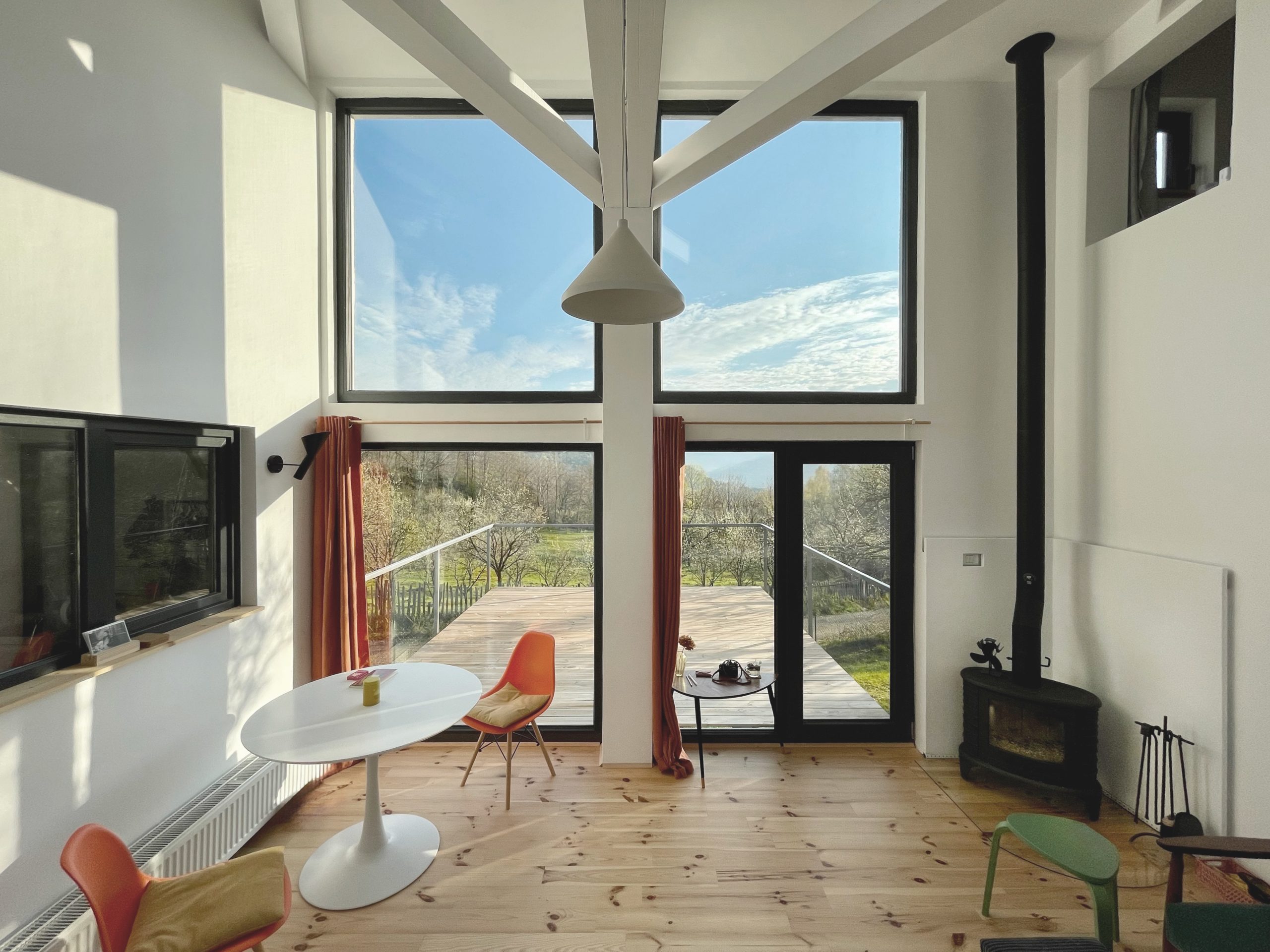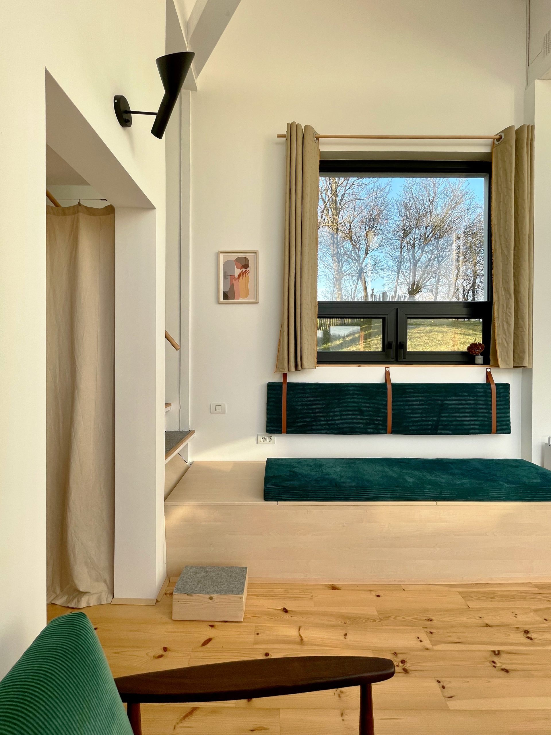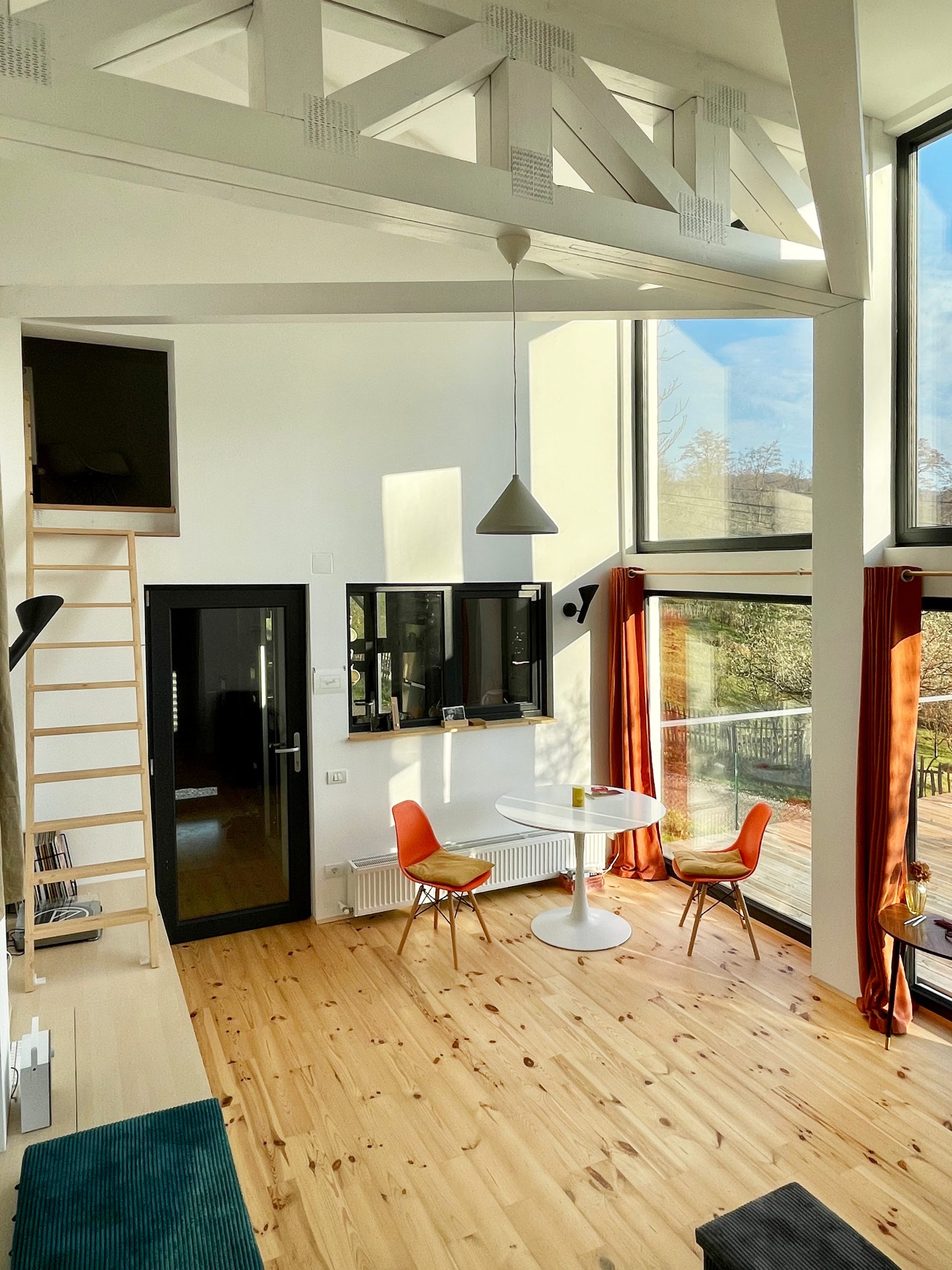 The cabin is a compact mountain retreat, designed with a dynamic, playful approach to scale. Discreet, enclosed spaces gather around a central, double-height chamber that opens broadly to capture sweeping scenic views. The essence of the project is captured in the longitudinal section. Two distinct outdoor areas enhance the experience: a sheltered ground-level space adjoining the kitchen, and a cantilevered terrace accessible from the living room, offering panoramic views of Paltinu Lake, located 5 km away. All rooms, except for the master bedroom and bathroom, are aligned in a sequence and interconnected through windows and openings that maintain a visual flow, creating a sense of interior facades throughout.